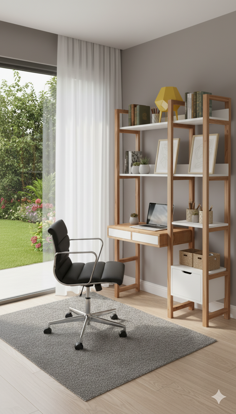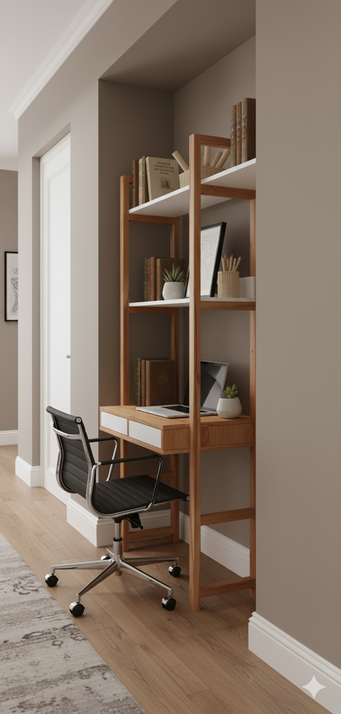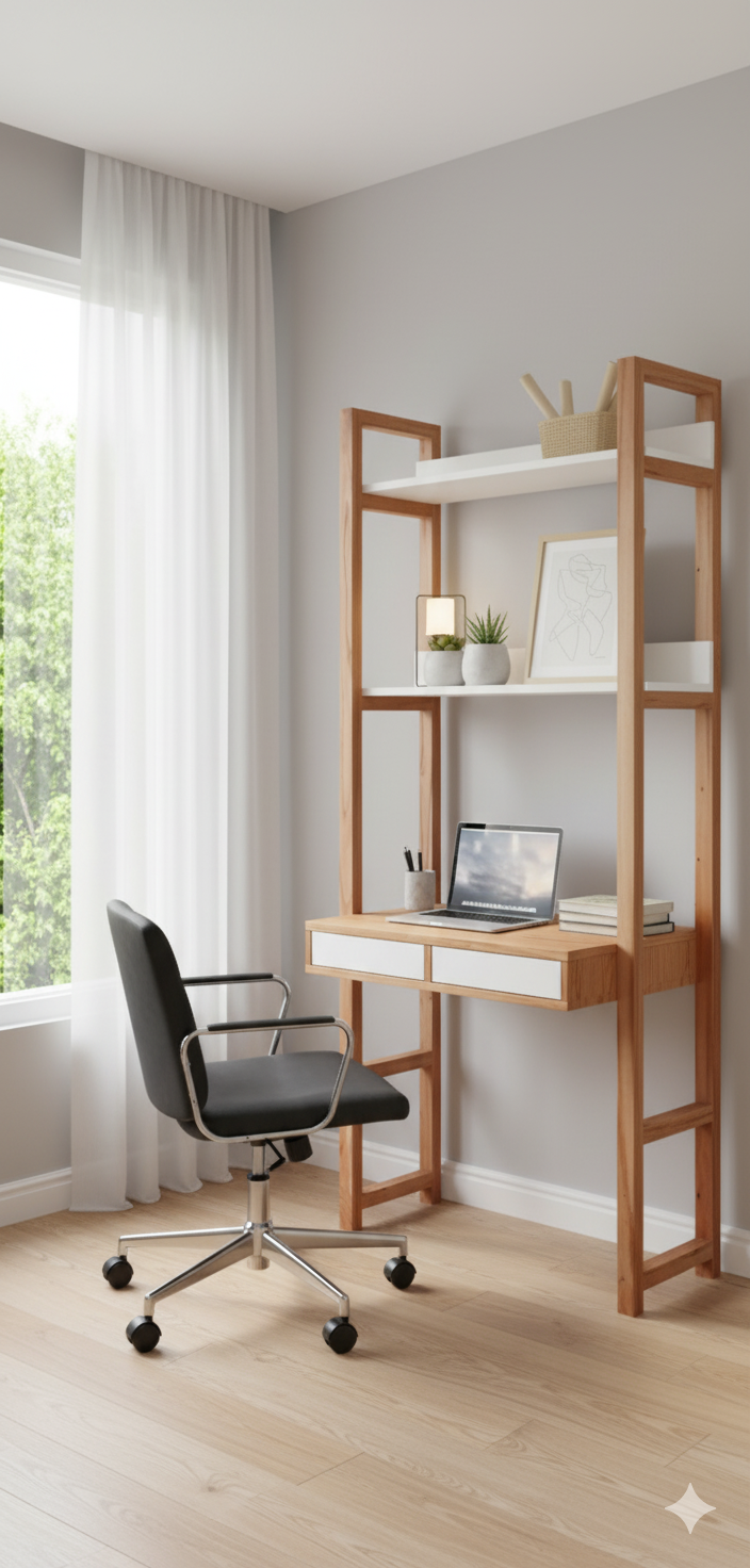 ✔ Diseño que optimiza el espacio , integrando estantes y escritorio sin sacrificar estilo